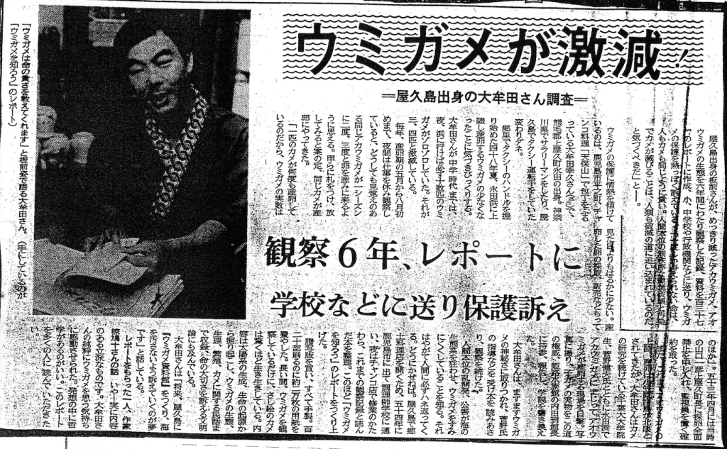(大牟田幸久氏執筆,2013年の屋久島徳洲会病院広報誌,屋久島のうみがめ73 ウミガメ保護四半世紀のあゆみ(1)より)