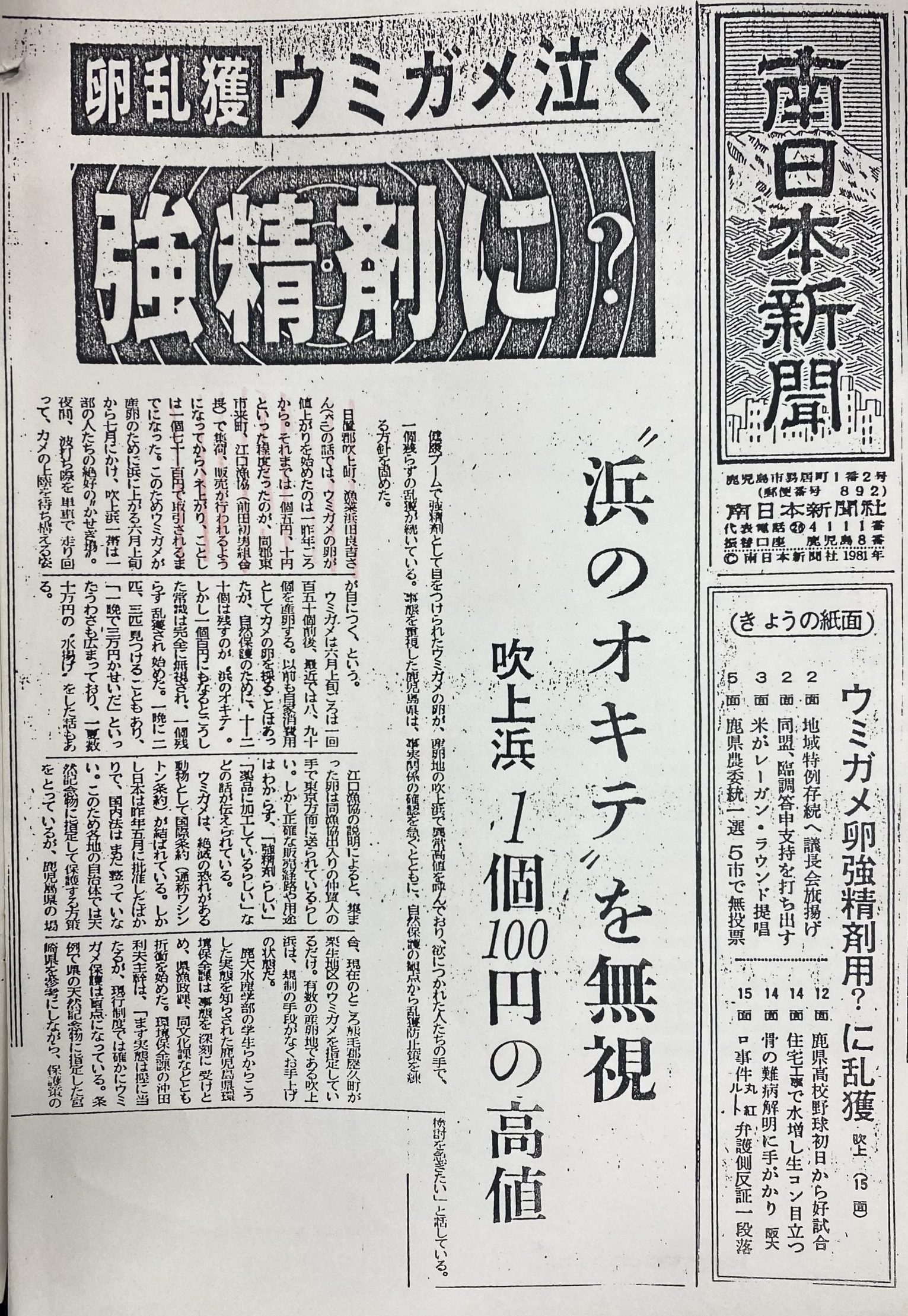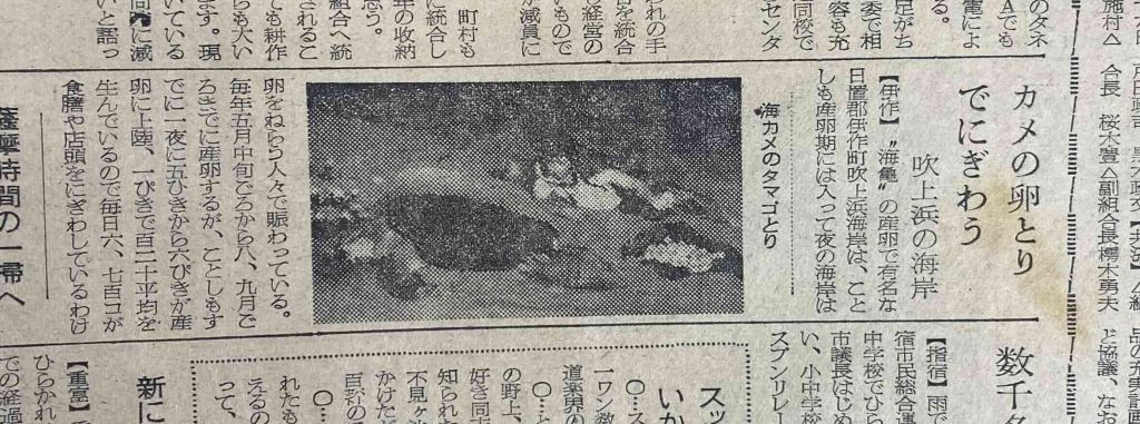 鹿児島県でも同様に戦時中〜直後は食糧不足のため、ウミガメの卵(場合によっては肉も)は貴重なタンパク源として利用されていた。自家消費・販売なども活発に行われていたと思われる。