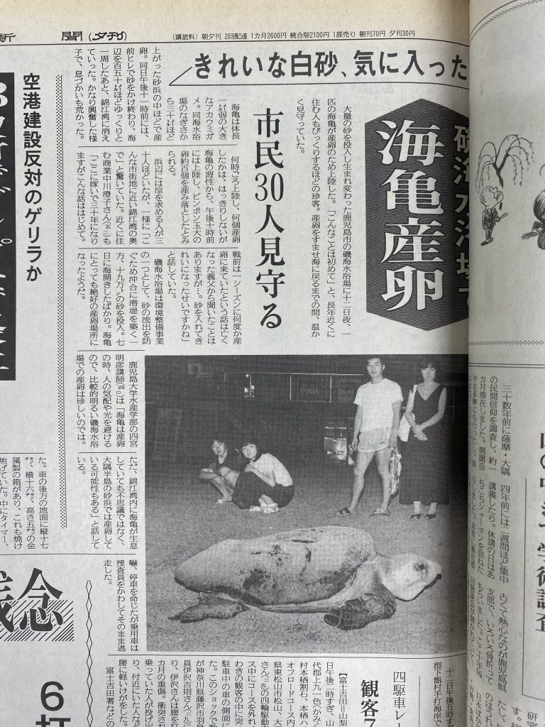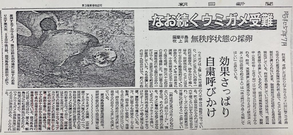 鹿児島大学生であった秋山友宏氏は、吹上浜でウミガメの卵が採られている現状に対して、「アカウミガメ研究会」を設立し保護を訴え始める。